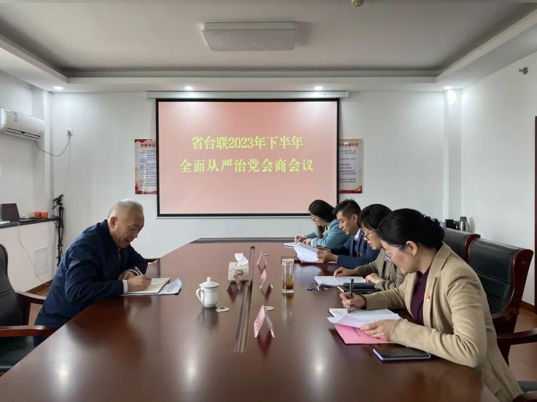 鹿妙红汇报了省台联党组2023年度全面从严治党工作情况和履行第一责任人职责情况,2名党组成员分别按照“一岗双责”要求,汇报了职责范围内的全面从严治党工作。刘建国针对存在的问题提出要求和意见建议。