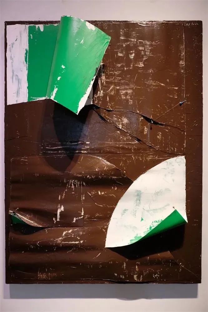 而此次展览作品所呈现的艺术实践既非对于版画本身语言的经营,亦非出于版画特性的观念延展,而是回到原本作为载体的材质本身。展览标题中的“板·画”并非媒介分类意义上的“版画”。就通常的木版画而言,木板所制作的“版”是转印的基底和模子,作品要在它之上拓印剥离而来。然而,出于对材质的敏感,康剑飞不断漫游于这种特殊的木性之中,将载体变成了作品表达的“本体”。这些板材被撕扯、叠加、拼贴,并覆盖以鲜明的色彩,使得原本抽象的平面绘画具有了空间上的纵深度和精神情绪上的浓度。在此基础上,他还借助木板的韧性,将部分板面卷曲起来,空间的折叠和牵引的鱼线让二维绘画再次被“破坏”、被颠覆,变得动荡和隐含“危险”,由此也造成了图像与材质之间滑动的新的生产关系。这种“画面”上的多重腾跃似乎随着艺术家身体的行动,在喘息、呢喃、低语……行走于星河旷野,步入幽深的丛林,刻写生命的维度。