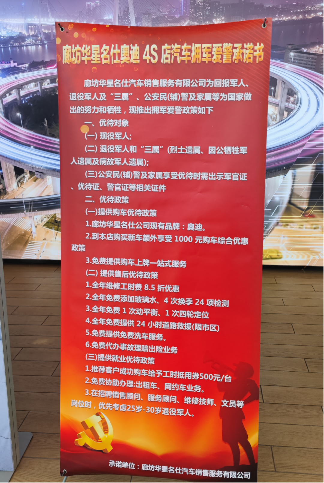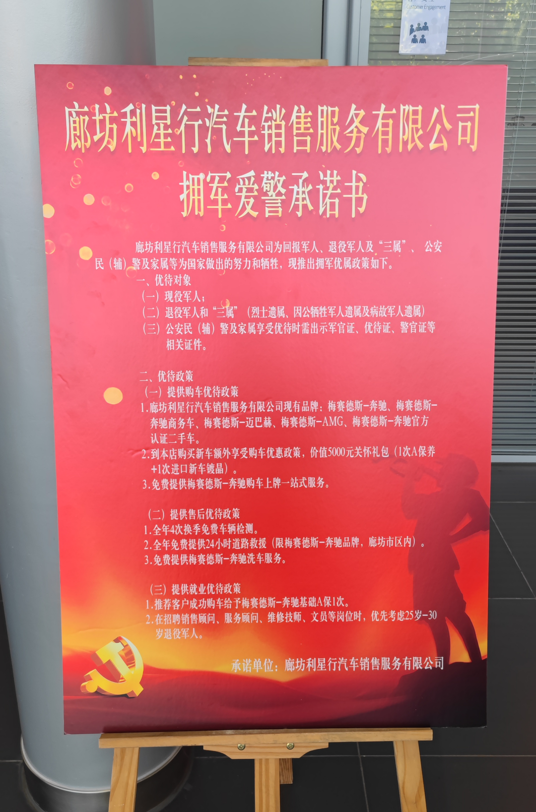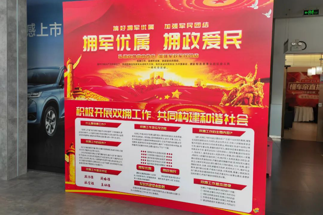 46家“拥军店”内,均在展厅醒目位置摆放了双拥政策解读和廊坊市双拥工作展板,在大屏幕上滚动播放双拥宣传图及宣传片,并在办事窗口处摆放“军人、退役军人优先”标识,多种形式弘扬崇军精神,营造浓厚的拥军氛围。