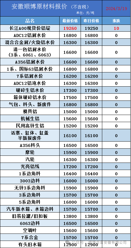 顺博合金安徽有限公司3月19日最新报价