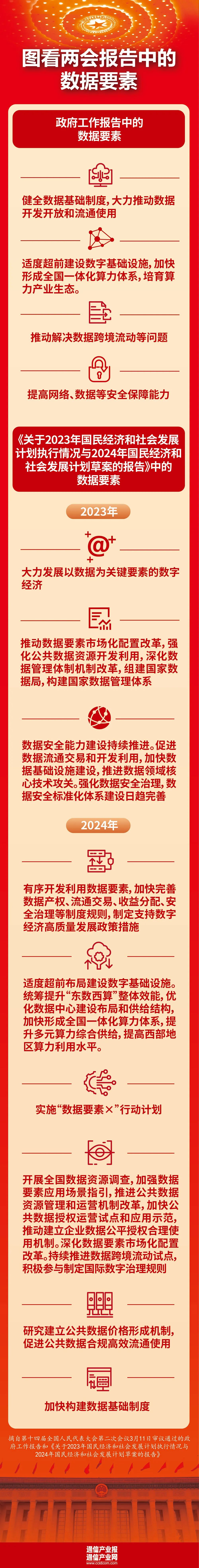 回顾今年全国两会,政府工作报告、《计划报告》等对数据要素开放开发、流通利用等方面的工作制定了明确的政策取向,提出了具体要求,将有力推动社会各方数据要素相关工作的开展。那么,今年两会报告关于数据要素都有哪些顶层设计?《通信产业报》全媒体梳理今年全国人大会议通过的政府工作报告、《计划报告》有关数据要素相关工作的表述,供业界参考。