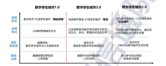 随着AI大模型快速发展,城市数字孪生体将实现自动化构建,并持续迭代丰富其属性内涵,城市所有业务场景均可转变为数字化算法模型,城市加快从传统的物理实体转变为复杂而智能的数字生态系统,将具有更高的自主性、智能化和自适应。未来,将形成数字孪生城市3.0,即数字城市将具备所有现实世界的运行规则和社会关系,可实现自动生长、自行决策、虚实共生,所有公众均具备“数字市民身份”,可通过虚拟现实设备进入数字城市,实现沉浸式体验,达到机器智能和人的智慧高度协同的高级状态。