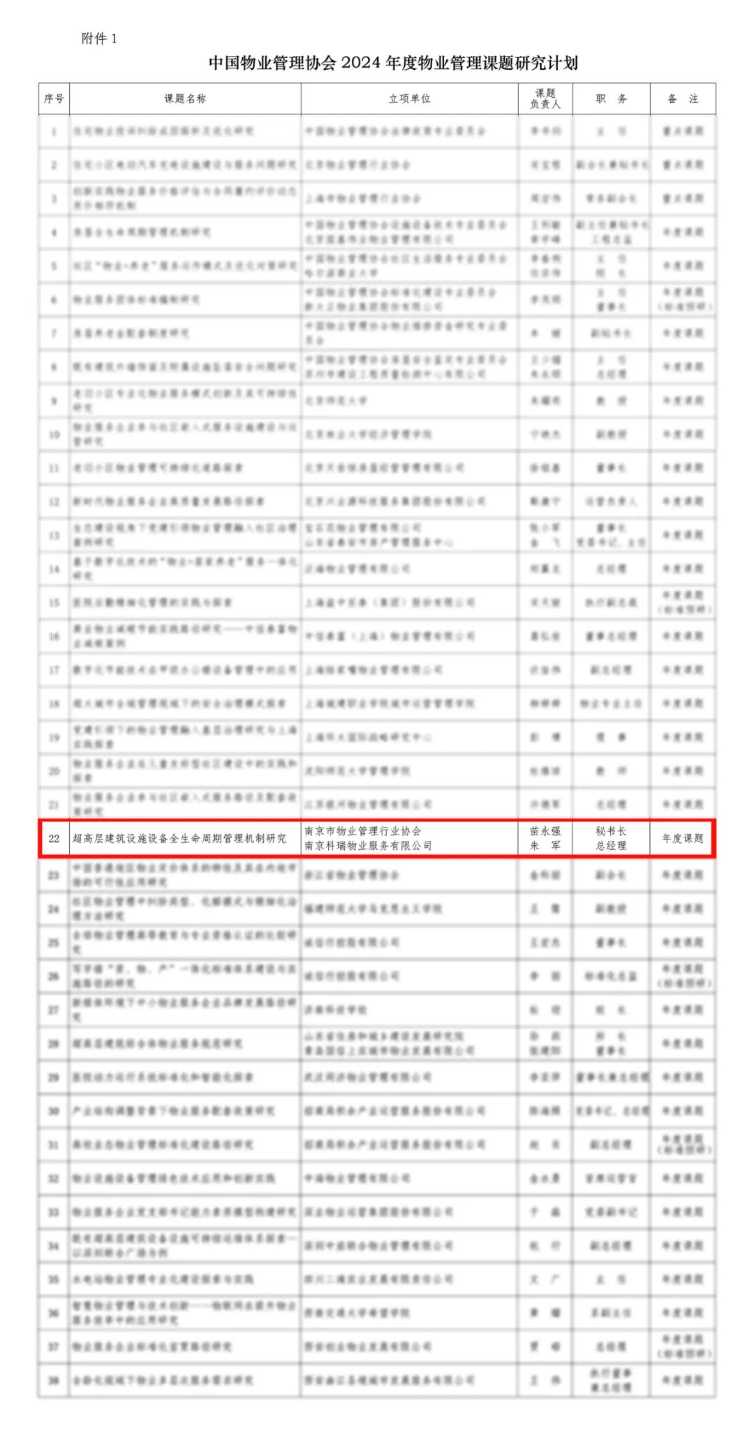 值得一提的是,在2024年3月15日中国物业管理协会发布的《关于印发2024年度物业管理课题研究计划的通知》中物协函〔2024〕26号文件中,南京市物业管理行业协会联合南京科瑞物业服务有限公司申报的《超高层建筑设施设备全生命周期管理机制研究》课题被确定为中物协2024年度物业管理课题研究年度计划。这项工作不仅彰显了南京市物业管理行业协会在课题研究方面的实力与水平,也进一步提升了协会在行业内的地位与影响力。