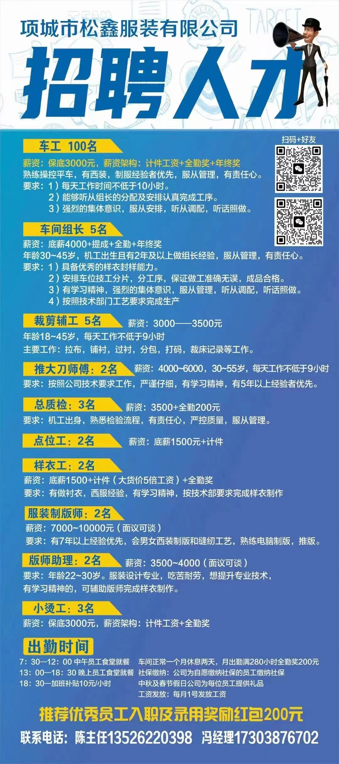 1⃣ 车工100名【保底3000元,计较工资+全勤+年终奖】