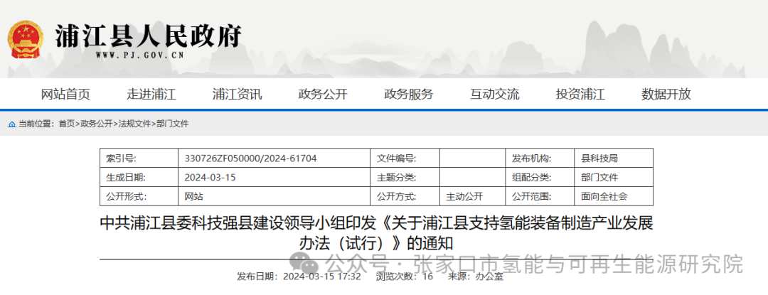 3月15日,中共浦江县委科技强县建设领导小组正式对外公布了《关于浦江县支持氢能装备制造产业发展办法(试行)》。