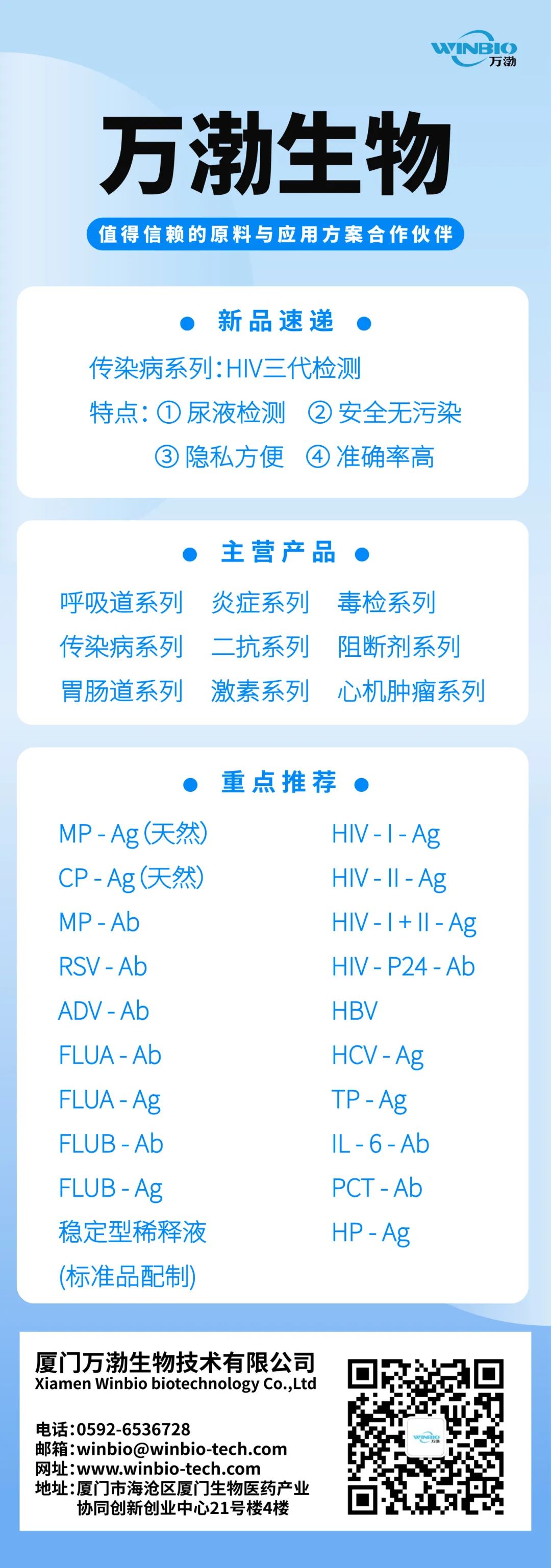 厦门万渤生物技术有限公司致力于为体外诊断试剂(IVD)提供优质抗原、抗体等活性原料及各种应用平台的应用方案,公司核心团队由具有30多年经验的技术专家及具有丰富体外诊断试剂上下游工作经验的技术骨干组成,产品覆盖重组蛋白、抗原抗体研发、生产及原料应用(包括发光、酶免、荧光、胶体金等技术平台)。