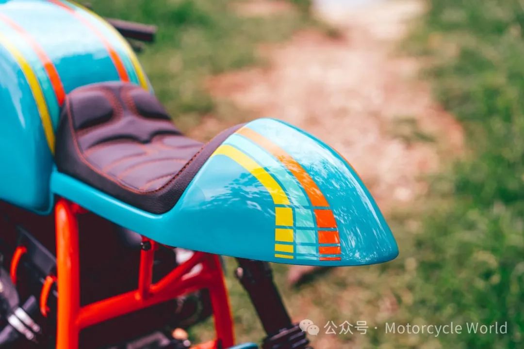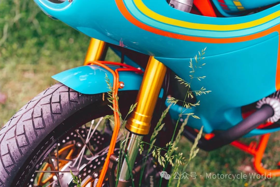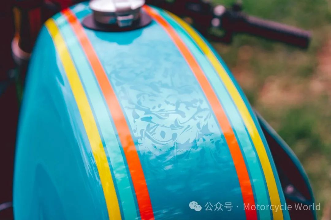 但最引人注目的当属这辆摩托车的外观。Eli决定打破常规,采用了一种独特的涂装方案。受到一辆老式路虎的启发,他选择了深绿、橙色、黄色和翡翠绿的颜色,打造出了一种迷幻的效果。即使对于一个色盲的艺术家来说,这种选择也是相当大胆的。