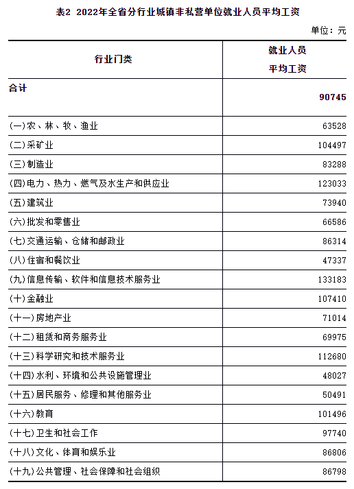 2022年,全省城镇非私营单位就业人员平均工资90745元,比上年增加8219元,增长10.0%,增速比2021年提高3.3个百分点。