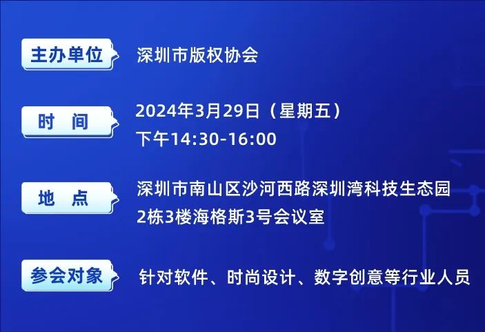 深圳市版权协会定于2024年3月29日下午举办《深圳版权产业发展分析评议成果发布会暨报告宣导会》。望相关行业各企、事业单位积极报名参与,有关事项通知如下: