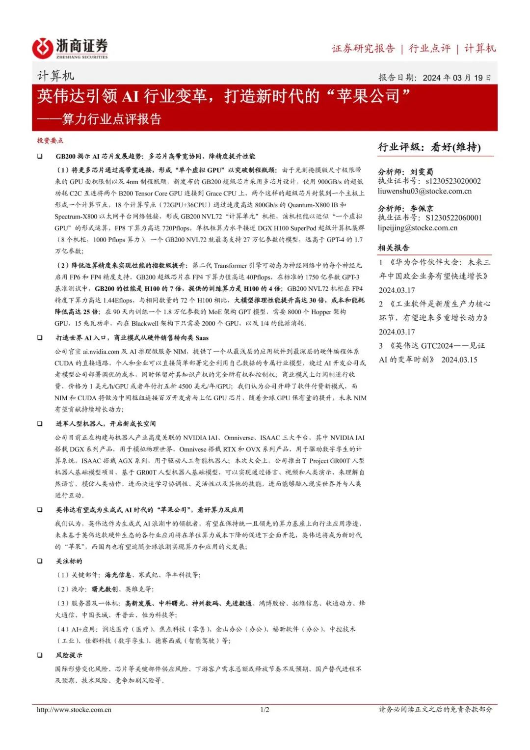 具体请参见2024年3月19日《英伟达引领AI行业变革,打造新时代的“苹果公司”——算力行业点评报告》,如需要报告全文或数据底稿,请联系团队成员或对口销售。