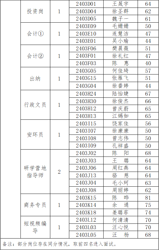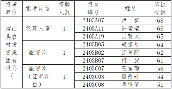 根据《常山县农村投资集团有限公司招录工作人员公告》精神,常山农投集团委托常山人才集团共同面向社会公开招录工作人员,经现场报名(资格审核)、复审、笔试等程序,现将入围面试人员名单公告如下,面试具体时间、地点由常山人才集团另行通知。