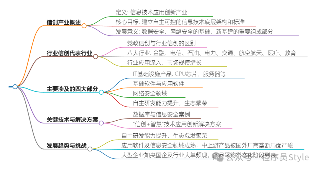 信创产业通过多种方式促进国家信息安全和数据安全的提升。首先,信创产业的目标是实现信息技术领域的自主可控和信息安全,这包括在基础硬件、基础软件、应用软件、信息安全等领域实现国产替代。这意味着通过发展信创产业,可以减少对外部技术和产品的依赖,从而降低信息安全风险。其次,信创产业涵盖了数据安全、网络安全以及其他新兴技术应用领域,这些领域的创新和发展有助于提高整体的信息安全水平。例如,数字证书作为实施安全认证的重要技术手段,在信创安全的发展中扮演着不可替代的角色。此外,信创产业的发展还聚焦于基础软件、基础硬件、应用软件、数字安全等主导产业,旨在提升产品服务供给能力,集聚具有高创新性、高成长性、强竞争力的信创企业。这种集聚效应不仅能够促进技术创新,还能通过规模化生产降低成本,进一步增强国家信息系统的安全性。《数据安全法》的实施也加速了信创产业的发展,云计算和物联网等新兴技术的发展驱动了新场景和信息安全的需求,数据安全成为国家经济社会发展的全领域、全过程的基础和保障。这表明信创产业的发展与国家信息安全和数据安全的需求紧密相关。最后,信创产业通过使用国产的操作系统和数据库等方式,帮助企业提高自主创新能力和市场竞争力,同时更好地保护自己的数据安全。这种自主创新能力的提升对于维护国家信息安全具有重要意义。信创产业通过推动国产化替代、加强数据安全和网络安全技术的研发、实施相关法律法规以及提升企业的自主创新能力和市场竞争力等多种方式,有效促进了国家信息安全和数据安全的提升。关注微信公众号《程序员Style》,每日获取技术干货。三、目前中国在信创产业核心技术研发方面取得了哪些进展?中国在信创产业核心技术研发方面取得了显著进展,主要体现在以下几个方面:- 自主可控的信息技术底层架构和标准的建立:信创的核心目标是推进国产替代,实现信息技术领域的自主可控。这包括在芯片、传感器、基础软件、应用软件等领域的全面国产化。