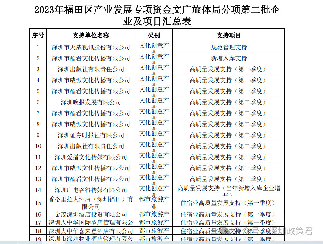 根据《深圳市福田区产业发展专项资金管理办法》及《深圳市福田区支持现代时尚与数字创意产业集群发展若干措施》、《深圳市福田区支持文化创意产业发展若干措施》、《深圳市福田区支持都市旅游产业发展若干措施》、《深圳市福田区支持都市体育产业发展若干措施》的规定,经审议,拟对以下企业及项目(详见附件)给予支持。现予以公示: