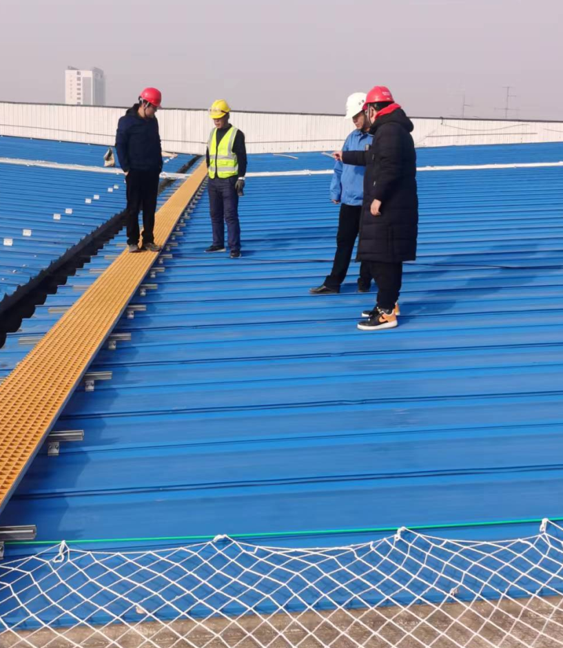 屋顶采光带采用一体夹具固定包塑钢丝绳,将安全网穿插在钢丝绳内,对屋面作业人员的安全起到保护作用,防止踏空坠落。