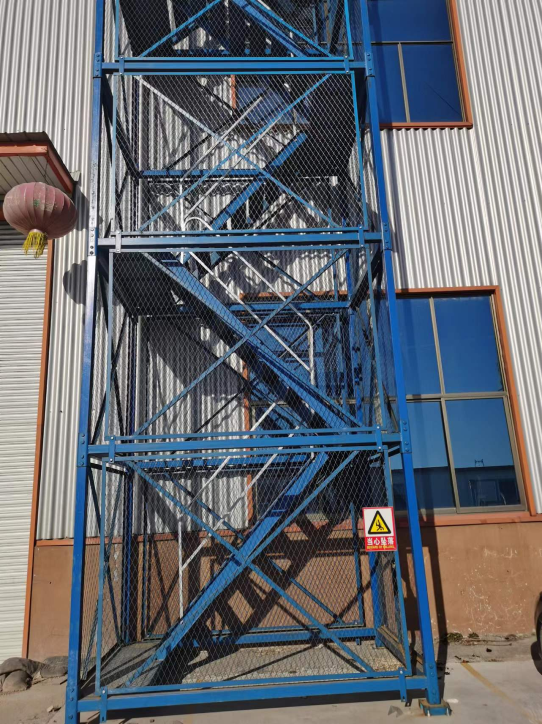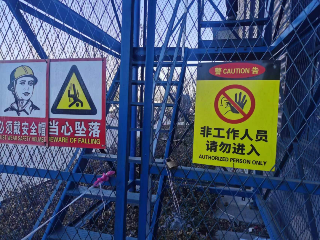 室外梯笼门口设置安全警示标识,门口上锁,禁止无关人员进入工作区。