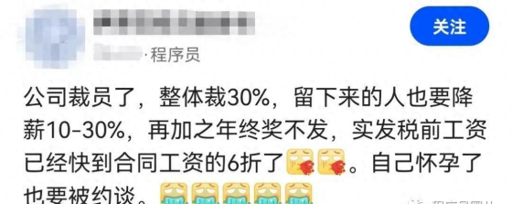就拿最近某汽车公司的裁员风波来说,据一位身处其中的程序员爆料:”公司整体裁员幅度高达30%,而留下的幸存者也难逃降薪的命运,降幅在10%到30%之间。更让人心寒的是,年终奖也不发了,手里拿到的税前工资已经降到合同工资的六折。”处在怀孕期间的她,面临着被约谈降薪的窘境,不同意就只能拿着”裁员大礼包”黯然离场。她陷入了两难的境地,是降薪保住饭碗,还是离职寻找新机会?