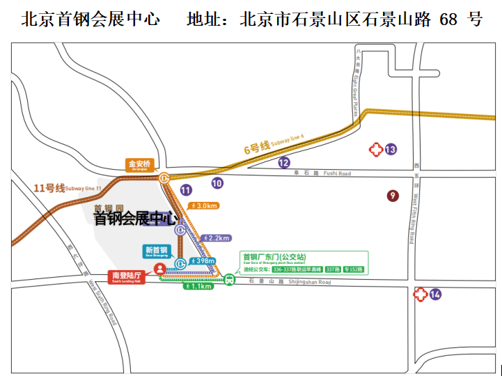 -可选择换乘北京地铁11号线(新首钢方向)新首钢站(D口出),步行近400米即可到达南登录厅。
