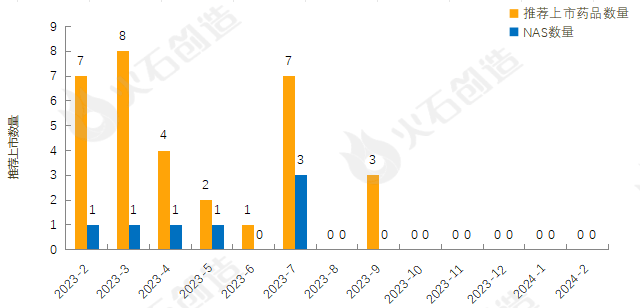 截至2024年3月7日EMA官网披露,2023年2月至2024年2月的推荐上市药品及新活性物质(NAS)数量情况见图2,2024年2月EMA未推荐药品上市。