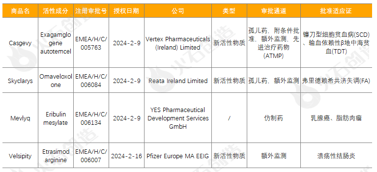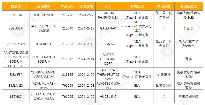如图1,截至2024年3月7日FDA官网披露,2024年2月FDA共完成58项药品首次批准(不包含暂时批准),其中NDA/BLA批准7款(不包含暂时批准),见表1。其中包括1款新获批的新分子实体药物(NDA:Type 1 - New Molecular Entity),2款生物制品药物(BLA)。其中武田的EOHILIA(布地奈德口服混悬液)用于治疗患有嗜酸细胞性食管炎(EoE)的成人和11岁及以上儿科患者,这是第一个获批用于治疗该疾病的口服疗法;AURLUMYN用于治疗成人严重冻伤(frostbite),以降低患者手指或脚趾截肢的风险,是FDA首个批准用于治疗严重冻伤的药物,该药曾于2004年获批用于治疗肺动脉高压,此次获批则是基于该药新的注射制剂的新用法;SIMLANDI是FDA批准的首个可互换的生物类似药,可与原研药修美乐(阿达木单抗)互换使用,其将为修美乐的用户提供更为经济实惠的替代品,同时也为医疗保健系统降低药物支出带来新的可能性。欧盟EMA批准情况