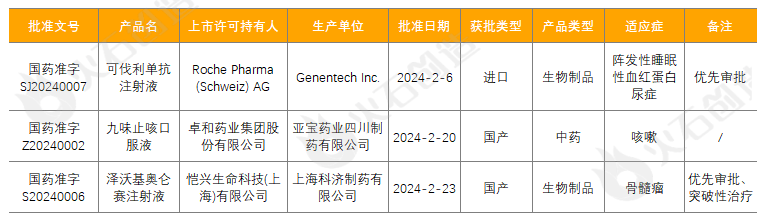 罗氏申报的可伐利单抗注射液通过优先审评审批程序上市,用于治疗未接受过补体抑制剂治疗的阵发性睡眠性血红蛋白尿症成人和青少年(≥12岁)患者。阵发性睡眠性血红蛋白尿已被纳入我国第一批罕见病目录,该药全球同步研发,中国首先批准上市,为患者提供了新的治疗选择。卓和药业申报的九味止咳口服液用于治疗急性气管-支气管炎中医辨证属风热证的咳嗽,由矮地茶、枇杷叶、麻黄、苦杏仁、薄荷、陈皮、竹茹、鱼腥草和炙甘草九味中药材精炼而成。该药品的上市为急性气管-支气管炎咳嗽患者提供了又一种治疗选择。科济药业生产的泽沃基奥仑赛注射液用于治疗复发或难治性多发性骨髓瘤成人患者,是继信达/驯鹿的伊基奥仑赛、复星的阿基仑赛、纳基奥仑赛、瑞基奥仑赛之后,第五款在国内获批的CAR-T产品。2023年1月,科济药业授予华东医药该款药品在中国大陆地区的独家商业化权益。本文转自“火石创造”公众号,中国产业大脑和产业大数据领先者。