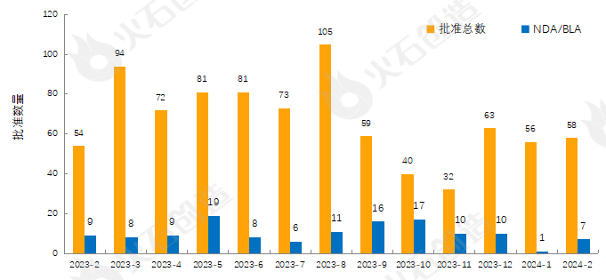 图1 2023年2月—2024年2月FDA药物批准数量变化情况