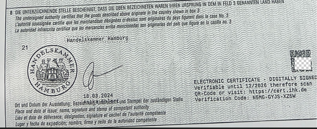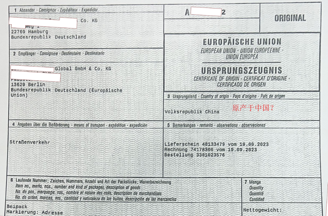 经过研究发现,原来这是一份德国汉堡商会为欧盟内部交易商签发的原产地证书,用来证明货物的身份的一种证明。货物在欧盟内部的流通,按照“中国原产”的待遇。