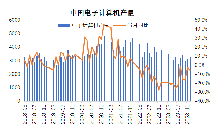 但电子计算机产量仍旧低迷,呈现10%-20%不等的下滑幅度。传统下游需求或伴随部分终端行业消费旺季的到来,排单消费量逐步增加,但目前全球消费环境下,下游接单量难有大幅增长动能,因此对PC的多刚需消化为主。
