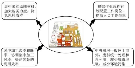 与传统餐饮业食品制作方式相比,中央厨房的优势具体体现在:集中采购原辅材料,降低原料成本;根据作业流程有效配置,提高工作效率;缓冲加工淡季和旺季,协调集中加工时段,提高装备的利用效率;中央厨房一般位于市郊或原料产区,有利于副产物的再利用或废料的统一处理,减少城市垃圾和环境污染。