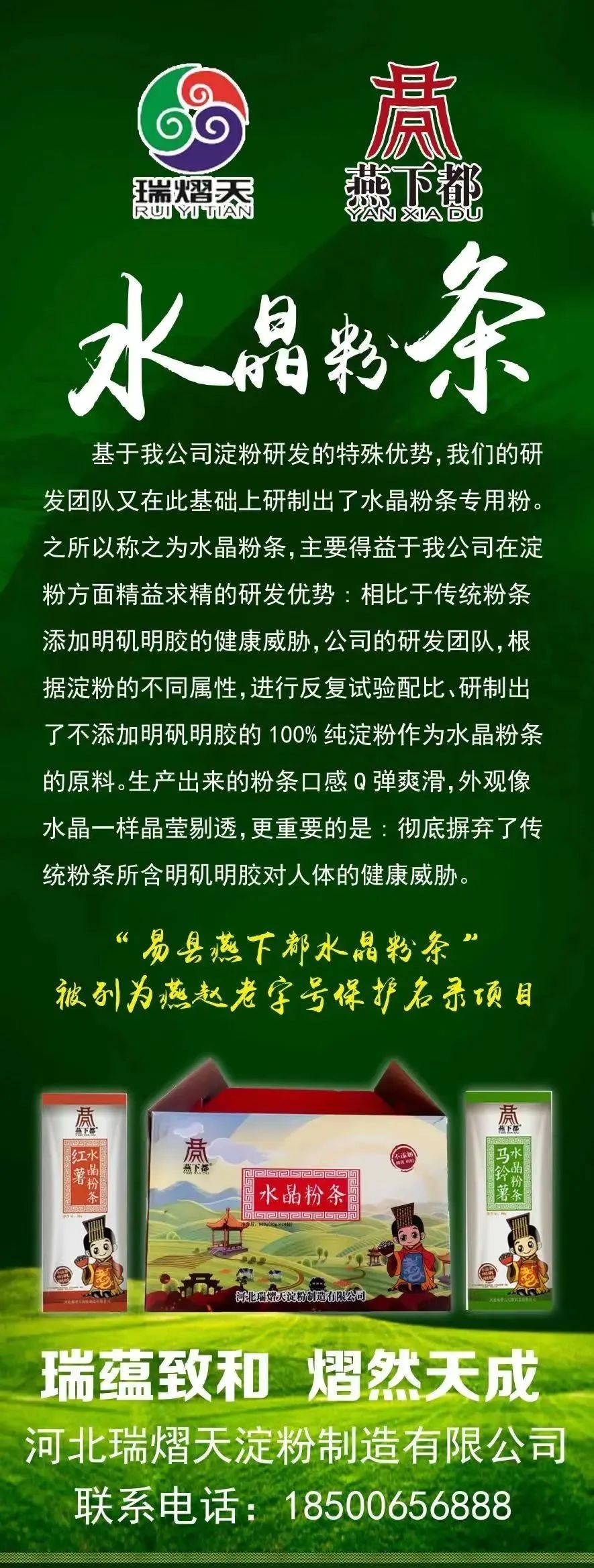 河北瑞熠天淀粉制造有限公司成立于 2015年 6月,位于保定市易县梁格庄镇石门店村,是一家集淀粉及淀粉制品、粮食加工品的研发、生产、销售为一体的高新技术企业。产品包含淀粉、水晶粉条、代餐粉、红薯、小米、大米、玉米糁等7大类,已建立完善危害分析与关键控制点管理体系(HACCP),拟申报绿色食品和有机食品认证。目前已在国家工商总局注册商标18个,其中“燕下都”商标,被评为“河北省优品牌”、“燕赵老字号”。