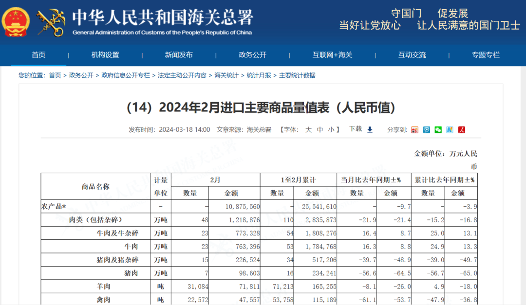 2024年2月进口肉类(含杂碎)48万吨,同比去年同期减少21.9%;