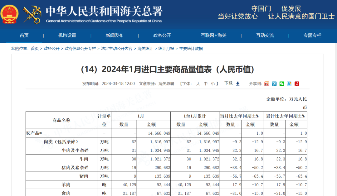 2024年1月进口肉类(含杂碎)62万吨,同比去年同期减少9.3%;