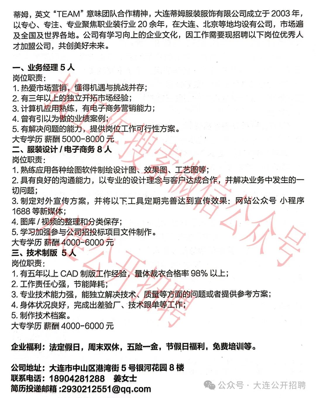 大连蒂姆服装服饰有限公司招聘