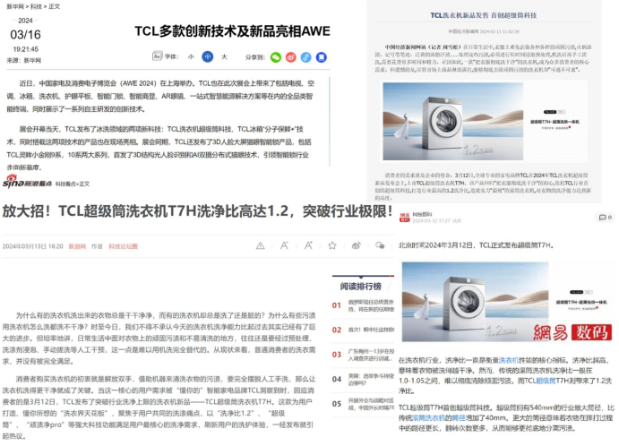 在现场,参观体验TCL超级筒洗衣机的观众络绎不绝,人气极为火爆,成为AWE 2024上明星产品之一。这一盛况,也受到新华网、新浪、网易、中国经济时报等主流媒体的密集报道。有行业分析人士认为,TCL凭借突破行业上限的1.2洗净比树立了洗净新标杆,而AWE作为家电行业消费趋势和技术走势的“风向标”,将进一步放大TCL超级筒洗衣机的声量,吸引更多人加入这场消费盛宴,推动行业迈向新的高峰。