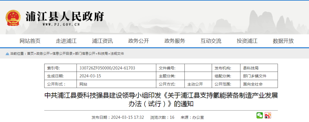 2024年3月15日,中共浦江县委科技强县建设领导小组印发《关于浦江县支持氢能装备制造产业发展办法(试行)》的通知。其中氢能方面提及:1.租金奖励。对落地浦江5年内的氢能装备制造企业租赁厂房的,按实际支付租金的比例予以奖励。2.园区建设。围绕制、储、运、加、用等全产业链环节,大力引进和培育氢能装备制造企业,建设氢能装备制造产业集聚区,符合条件的区内企业优先供地支持。3.主体培育。引进和培育一批氢能装备制造产业省科技领军企业、省科技小巨人企业、专精特新“小巨人”企业、专精特新重点“小巨人”企业。企业研发费用较上年度增长部分按20%奖励,单个企业不超过200万元。4.设备奖励。经备案或核准的氢能装备产业项目(含新投产项目〔新设立企业〕),建成投产且投资纳统的,对投入全新生产设备(单台不低于2万元)投资额在100万元(含)以上的项目,按生产设备实际投资额分档奖励。5.创新载体。依托高校、科研院所、骨干企业联合设立氢能装备创新研究院,研究院建设所需资金由县财政予以保障。支持氢能装备制造企业设立研发机构、技术中心和工业设计中心:对首次认定为省重点企业研究院、省企业研究院、省研发中心的企业,每家分别奖励100万、60万元、40万元;对首次认定为省级、市级企业技术中心的企业,每家奖励100万元、20万元;对首次认定为省级、市级工业设计中心的企业,每家奖励50万元、10万元。(责任单位:县科技局、县经济商务局、县财政局)6.人才支持。聚焦氢能全产业链装备制造,加大高端人才和团队引进力度。7.技术攻关。鼓励氢能装备制造企业开展核心技术攻关,获国家级、省级重大专项、重点研发计划项目立项的企业,按上级规定给予资金配套,无明确规定的,按上级补助经费的50%给予奖励,最高不超过800万元。8.标准制定。推动氢能装备企业、行业协会积极参与标准化工作,提升企业标准水平和产品质量。9.金融支持。设立总规模不超过20亿元的氢能产业发展投资母基金,引导社会资本参与我县氢能装备产业发展,推动氢能装备企业资本化进程。10.行业交流。支持相关部门、国内外行业组织、有关企业开展氢能装备制造产业论坛、峰会、展会等学术交流和产品展示活动。中共浦江县委科技强县建设领导小组印发《关于浦江县支持氢能装备制造产业发展办法(试行)》的通知各乡镇党委、政府,各街道党工委、办事处,县机关各部门、县属各单位:《关于浦江县支持氢能装备制造产业发展办法(试行)》已经县委、县政府领导同志同意,现印发给你们,请认真贯彻落实。为抢抓氢能产业发展机遇,促进浦江县氢能装备制造产业高质量发展,制订扶持政策如下:1.租金奖励。对落地浦江5年内的氢能装备制造企业租赁厂房的,按实际支付租金的比例予以奖励。其中,年度营业收入达到2000万元(含)以上的,按实际支付租金的100%奖励,每年不超过200万元;年度营业收入2000万元以下的,按实际支付租金的60%奖励,每年不超过100万元。对购置国有企业标准厂房的氢能装备制造企业,按购置价的10%奖励,单个企业不超过1000万元。(责任单位:县科技局、县经济商务局、县投资促进中心、县财政局)2.园区建设。围绕制、储、运、加、用等全产业链环节,大力引进和培育氢能装备制造企业,建设氢能装备制造产业集聚区,符合条件的区内企业优先供地支持。积极引进第三方管理团队建设和运营氢能装备制造专业孵化器,持续优化氢能装备制造创新创业生态。(责任单位:县科技局、县经济商务局、县发改局、县投促中心、县财政局、县产投集团)3.主体培育。引进和培育一批氢能装备制造产业省科技领军企业、省科技小巨人企业、专精特新“小巨人”企业、专精特新重点“小巨人”企业。企业研发费用较上年度增长部分按20%奖励,单个企业不超过200万元。(责任单位:县科技局、县财政局、县经济商务局、县投促中心)4.设备奖励。经备案或核准的氢能装备产业项目(含新投产项目〔新设立企业〕),建成投产且投资纳统的,对投入全新生产设备(单台不低于2万元)投资额在100万元(含)以上的项目,按生产设备实际投资额分档奖励:100万(含)至500万元的,按12%奖励;500万元(含)至2000万元的,按15%奖励;2000万元(含)以上的,按22%奖励;超过1亿元(含)的,按照“一事一议”政策实施奖励。(责任单位:县经济商务局、县财政局)5.创新载体。依托高校、科研院所、骨干企业联合设立氢能装备创新研究院,研究院建设所需资金由县财政予以保障。支持氢能装备制造企业设立研发机构、技术中心和工业设计中心:对首次认定为省重点企业研究院、省企业研究院、省研发中心的企业,每家分别奖励100万、60万元、40万元;对首次认定为省级、市级企业技术中心的企业,每家奖励100万元、20万元;对首次认定为省级、市级工业设计中心的企业,每家奖励50万元、10万元。(责任单位:县科技局、县经济商务局、县财政局)6.人才支持。聚焦氢能全产业链装备制造,加大高端人才和团队引进力度。在县域内企业服务的博士(含)及以上非全职人才,年薪酬待遇达30万元以上的(在浦缴纳个税),经特色人才认定,可对照全职人才享受相关人才政策。(责任单位:县委人才办、县财政局)7.技术攻关。鼓励氢能装备制造企业开展核心技术攻关,获国家级、省级重大专项、重点研发计划项目立项的