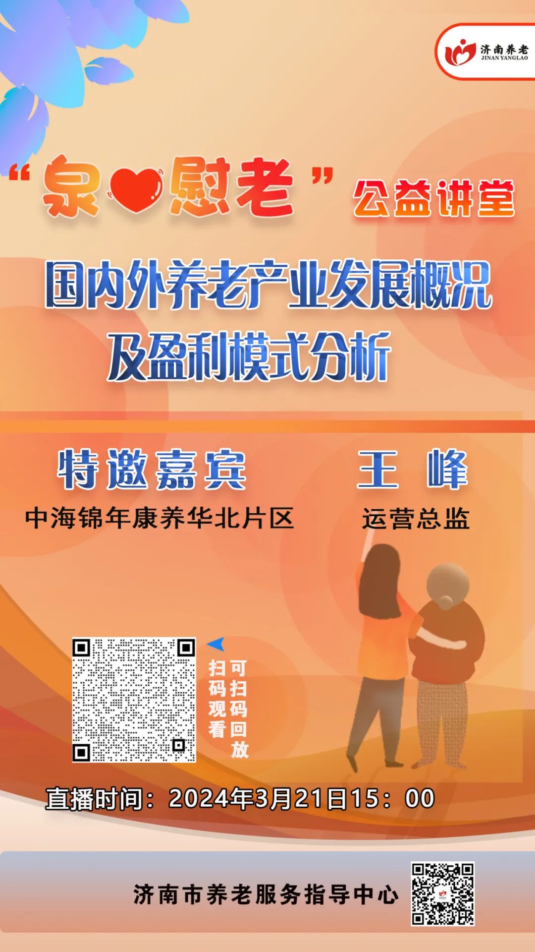 为帮助全市养老服务机构更好了解当下养老产业的发展状况,2024年3月21日(周四)下午3点,市养老服务指导中心将邀请中海锦年康养华北片区运营总监王峰来到“泉心慰老”公益讲堂直播间,进行国内外养老产业发展概况及盈利模式培训。
