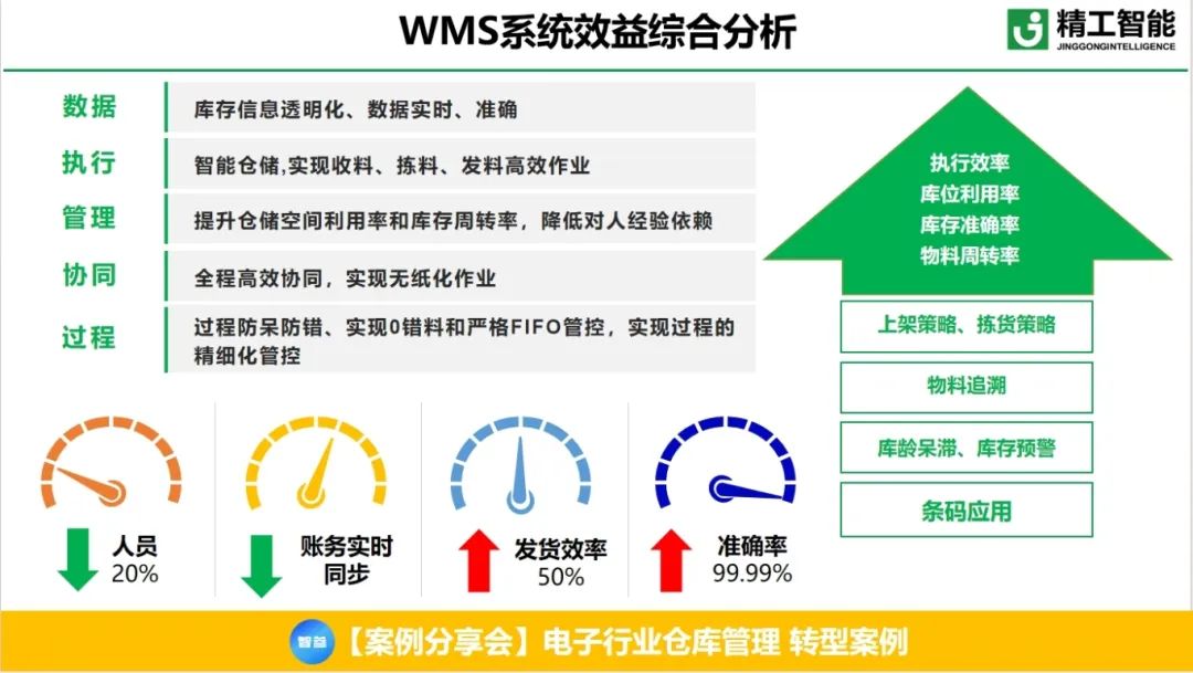 精工智能WMS能实现账务实时同步;人员减少20%;发货效率提升50%;准确率达99.99%。