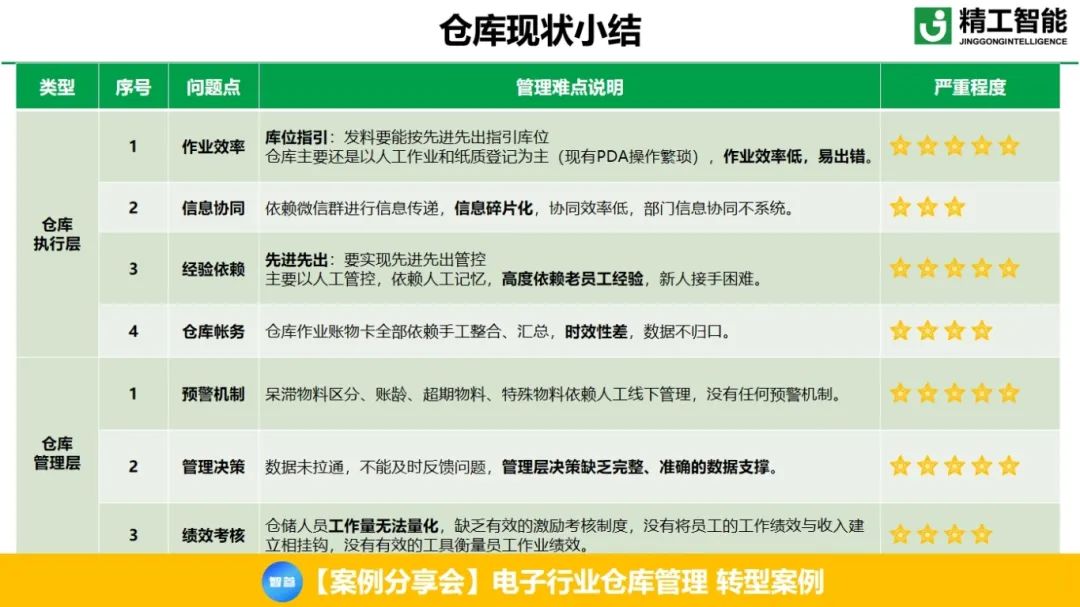 本次【案例分享会】我们邀请到精工智能高级售前顾问方猛老师,为我们分享“电子行业仓库管理 转型案例”。