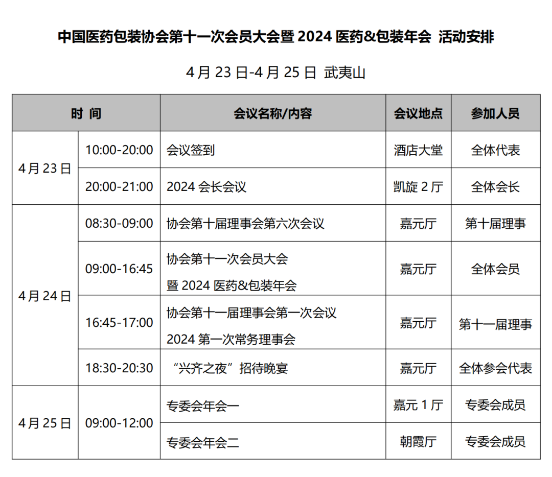 人勤春来早,奋斗正当时。第十一次会员大会暨2024医药&包装年会将于4月23-25日在福建武夷山市召开。( 点击查看日程 )