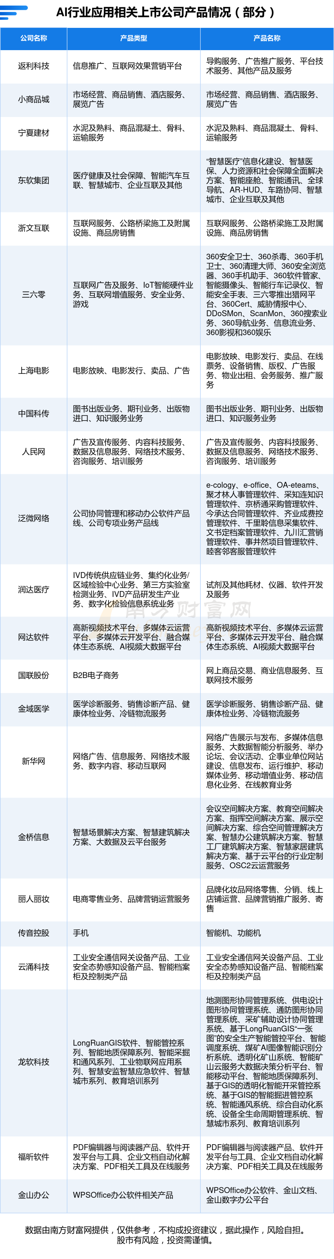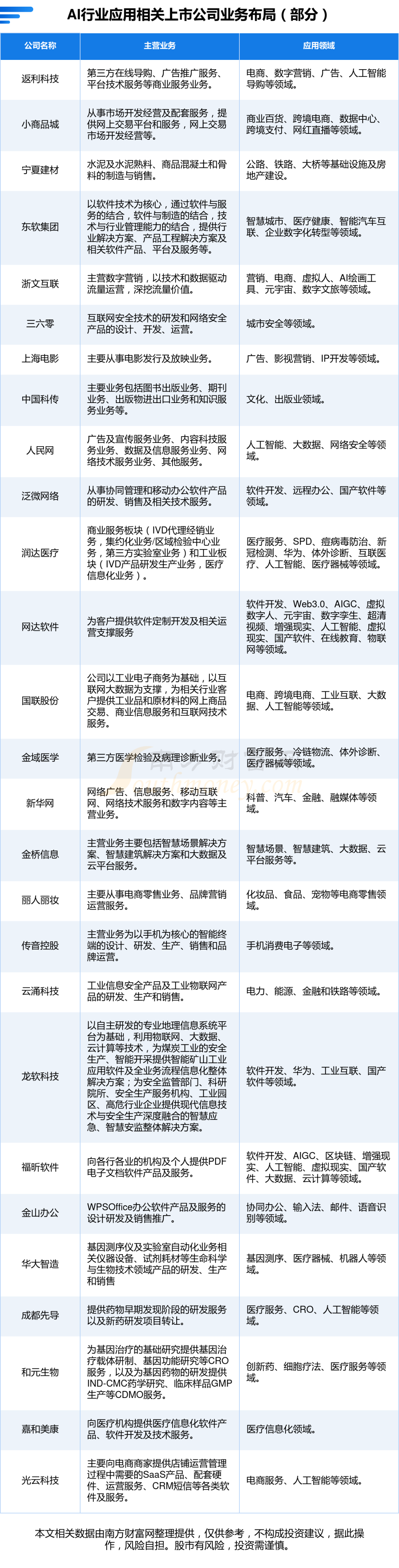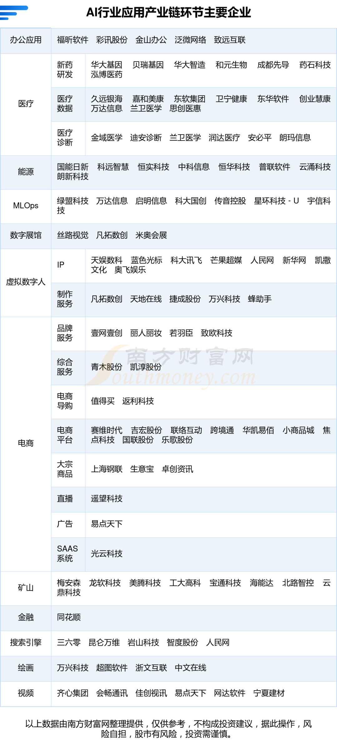 AI行业应用产业链有办公应用、医疗、能源、MLOps、数字展馆、虚拟数字人等环节。办公应用公司主要包括福昕软件、彩讯股份、金山办公等;医疗包括新药研发、医疗数据、医疗诊断,公司主要包括泓博医药、思创医惠、朗玛信息;能源公司主要包括国能日新、科远智慧、恒实科技等;MLOps公司主要包括绿盟科技、万达信息、启明信息、科大国创等;数字展馆公司主要包括丝路视觉、凡拓数创、米奥会展。