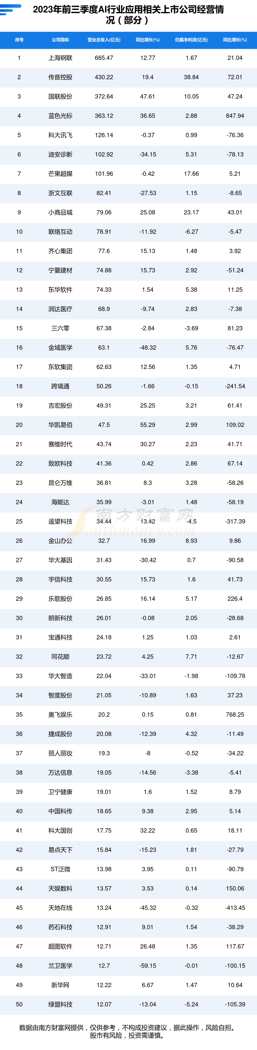 据统计,2023年前三季度,A股105家AI行业应用相关上市公司营业收入合计4033.17亿元,归母净利润共178.97亿元。其中,7家上市公司营业收入超100亿,58家上市公司营业收入超十亿。营业收入前三的为上海钢联、传音控股、国联股份,营业收入分别为665.47亿元、430.22亿元、372.64亿元。