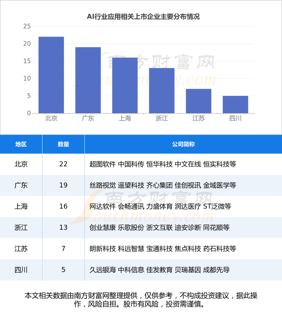 当前,A股市场共有105家AI行业应用相关上市公司,主要分布在北京、广东、上海、浙江、江苏等地区。其中,北京22家,广东19家,上海16家,浙江13家,江苏7家。