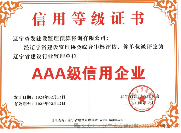 2月13日,经辽宁省建设监理协会公示,咨发监理公司荣获最高等级---AAA级。本次评价是辽宁省建设监理协会首次对省内承担任务的监理单位组织开展的信用评价,对参评企业在企业信用、诚信体系以及服务方面给予综合评价。