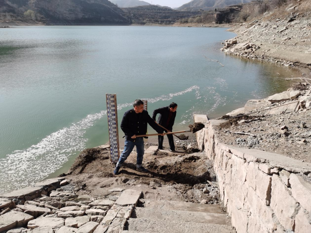 7.盘河水库管理处副主任贾黎虎带领业务科对农业水价改革农田灌溉渠道改造进行测量;库区站清理水尺周围淤泥;西原供水站检测各管线水质。