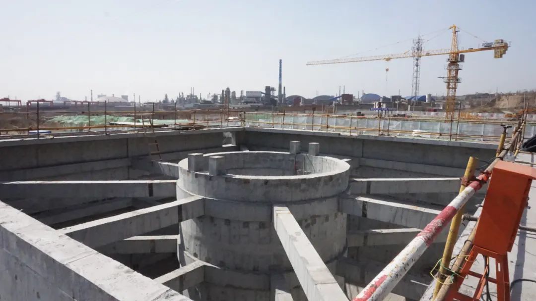 累计形象进度:加药间主体工程已完成;1#、2#澄清池主体结构已完成;3#、4#澄清池已浇筑到+8.0m,剩余2.4m;5#、6#、7#、8#澄清池下椎体承台混凝土浇筑到-6.0m。