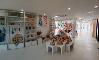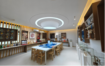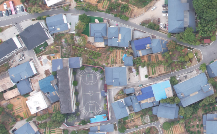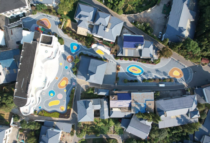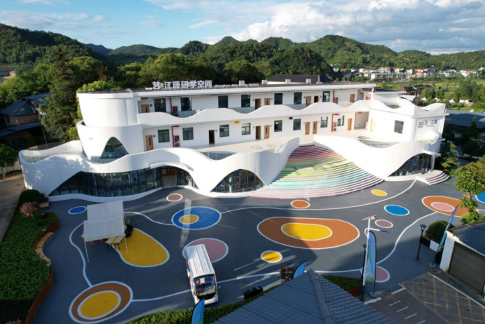 江口小学占地2200平方米,原教学楼面积1100平方米,2米高的白色围墙把学校完全封闭起来,周边又被民宅围绕,场地空间狭小,视觉空间闭塞。学校操场南侧有一片菜地,菜地内有杂物用房和电线杆,显得较为凌乱。如何让学校操场与菜地形成一个整体,让狭促的两个空间合二为一、是留给景观设计师的难题。首先拆除学校围墙,征用小学东侧农田,形成与主干道联通的开敞空间;然后把菜地改造成口袋公园,并赋予口袋公园更丰富的研学功能,形成操场之外的第二拓展空间;最后把两个相对独立的场地通过地面彩绘的方式进行串联,形成相互渗透的共享空间。“操场+公园”极大的突破了学校周边房屋密集的瓶颈,让游客可以更好的从主路走进公园,进入“艺·江源”开启江口艺术研学之旅。把原教学楼改造成艺术研学空间是本次改造的重点,更是难点。原有教学楼为一栋三层砖混结构建筑,建筑形态呆板,是典型的九十年代通廊式建筑,外墙面为白色瓷砖,局部有脱落和破损。由于建设年代久远,内部功能已不能满足现代研学使用要求,需要对其进行改造。我们遵循乡改设计原则的初心,以“尊重现有建筑制式,保护现有建筑形态,通过嫁接新体块激活现有建筑空间”的理念,让老建筑在原乡环境下散发出新的生命力。以“江口”作为设计立意的原点,以“水波纹”作为元素符号进行提炼,运用建筑设计手法对新老建筑体块进行镶嵌,以柔美的曲线作为建筑的轮廓线和天际线,让老的建筑形态发生质的变化,似流动的河水,又像盛开的花朵,非常具有张力,寓意着研学少年们朝气蓬勃的动感青春。根据研学基地的后期运营要求,我们对建筑的内部空间也进行了针对性改造。首先是空间扩容,原建筑的室内空间基本以教室、办公室、实验室、活动室、教职工休息室、餐厅和厨房构成,功能单一,没有大的展示空间。设计师利用L型建筑的半包围结构围合出一个具有水波纹形态的裙房作为研学展厅,并通过室外大台阶直通展厅的屋顶,此屋顶平台可作为汇报演讲、活动表演的室外舞台,与学校的操场形成一个完美的立体互动空间。同时学生们也可通过大台阶直达二层的研学教室,使学校的建筑空间更加灵活开放,弱化了爬楼梯的枯燥感。之后我们还完善了教学楼的其他使用空间,如在一层增加了多功能艺术厅和特展展厅;把二层原有的普通教室改造成油画美育室、综合绘画室、木板雕刻室、国画教室;把三层原来的微机室、音乐教室、实验室改造成竹丝扣编教室、颜料色彩教室、瓷胎美绘教室等跟艺术研学相关的研学空间。最后我们对二层和三层室外连廊进行微改造,让连廊由原来的直线形变成现在的波浪形,与裙房上下呼应,整体感十足。铝板与白色真石漆的巧妙搭接,彩色微水泥的适度运用,让建筑看起来简约但不简单。