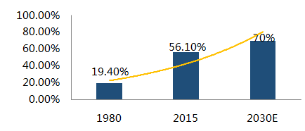 1980-2030年中国城镇化率增长
