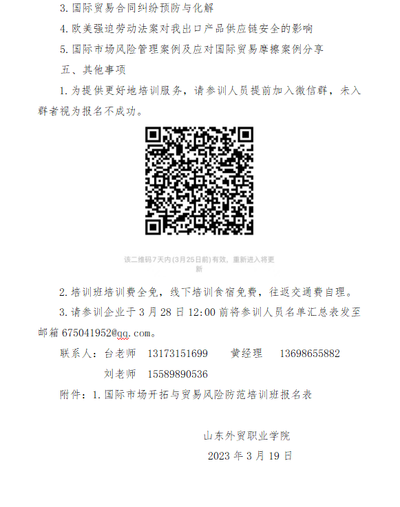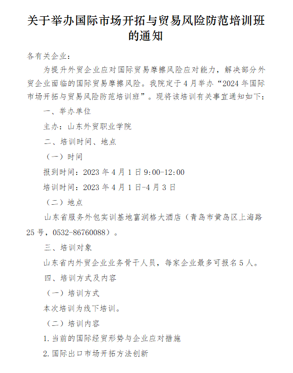 为提升外贸企业应对国际贸易摩擦风险应对能力,解决部分外贸企业面临的国际贸易摩擦风险。山东外贸职业学院定于4月1-3日举办“2024年国际市场开拓与贸易风险防范培训班”。各企业内部外籍外贸人员也可报名参加,食宿免费,交通费自理(如会员企业报名较多,协会秘书处将统一组织大巴前往)。请各会员企业3月25日前填写报名表并扫码入群(通知内二维码),同时将报名表格发送至邮箱lsqcxh@.com,联系电话:0537-7765879。