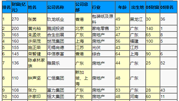 2006年胡润版中国十大富豪