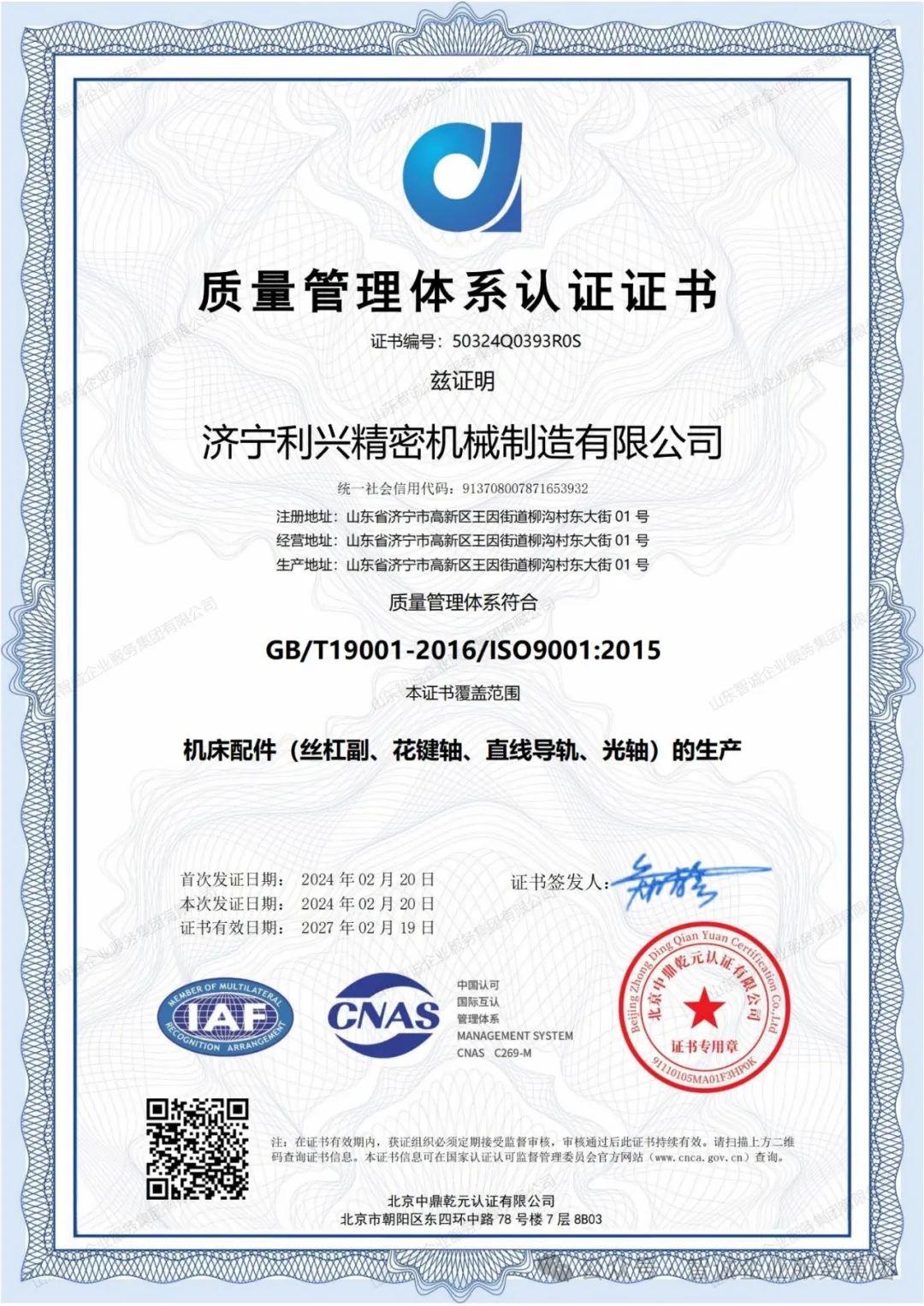 济宁利兴精密机械制造有限公司通过国家认监委备案机构的ISO9001质量管理体系认证审核,