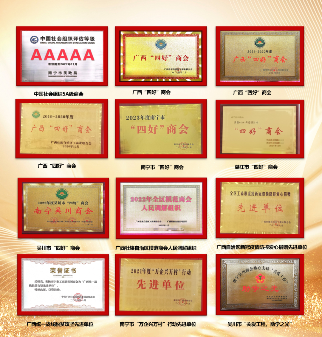 根据吴川市委统战部、市工商联组织考核,一直以来,南宁吴川商会始终坚持党的正确领导,扎实做好政治引领工作;不断优化内部治理结构,提升团队凝聚力;创造良好发展环境;同时,勇于开拓创新,积极参与并推动各项公益活动助力乡村振兴。2023年,南宁吴川商会不负众望,以完善的服务体系、规范化的管理模式和对会员企业的全方位支持,获得了吴川市2023年度“四好”商会的荣誉。